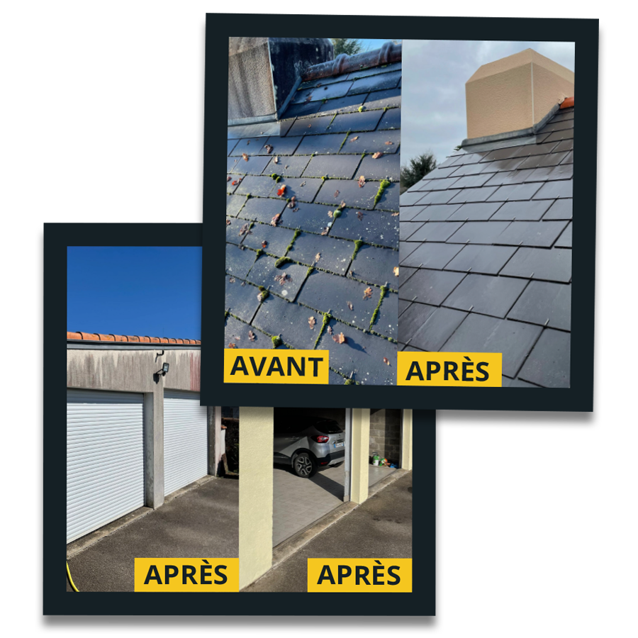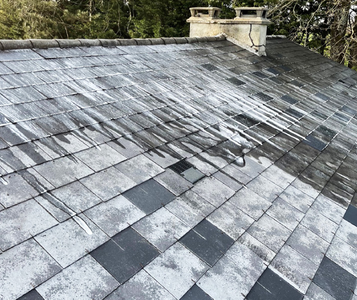 Traitement anti-mousse pour traiter et empêcher la prolifération des algues, des lichens, des mousses ect.. Remaniement des tuiles & ardoise cassé. Rebouchage des fissures